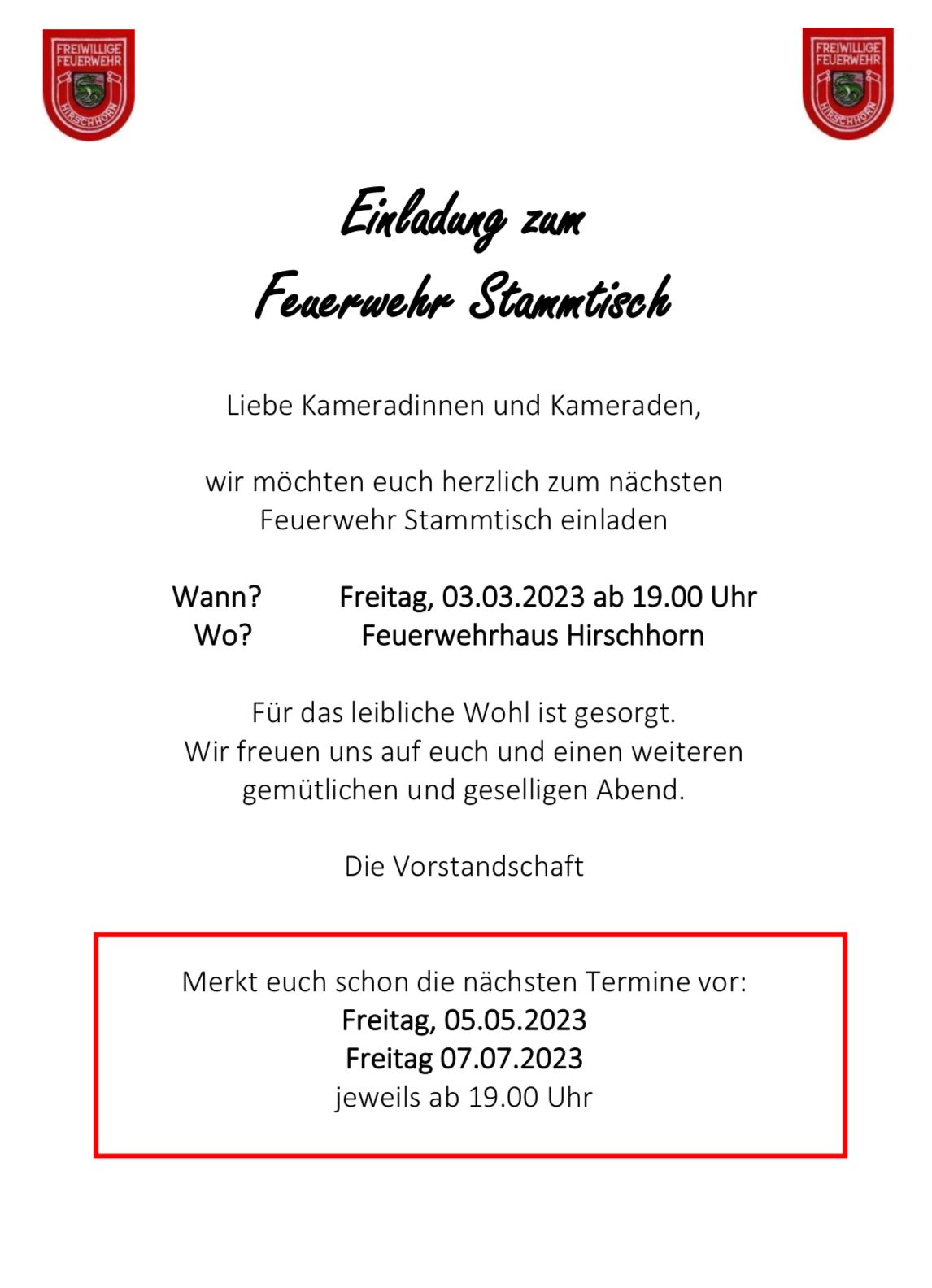 Liebe Kameradinnen und Kameraden, wir möchten euch herzlich zum nächsten Feuerwehr-Stammtisch am 05.05.2023 bei uns im Feuerwehrhaus einladen.